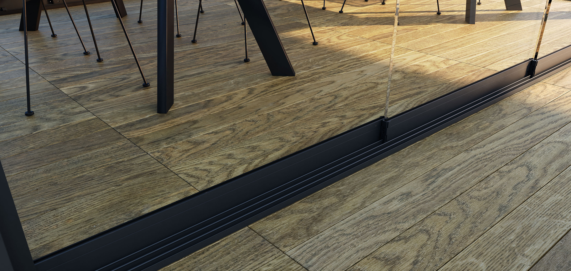 Vetrate scorrevoli con ante senza profili e guida a pavimento ridotta in altezza a soli 18mm. Di...