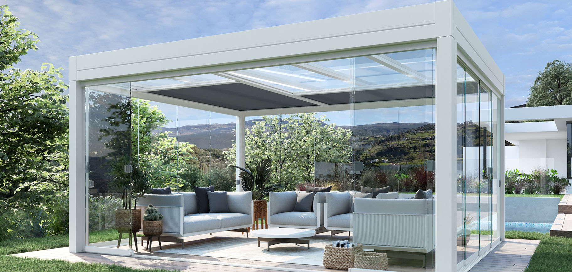 Possibilità di chiusura con tende tecniche verticali integrate, sistemi di vetrate scorrevoli e Roof tens per una schermatura sopra e sotto tetto