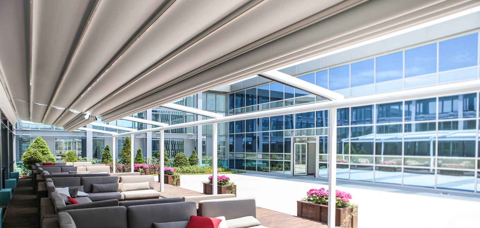 Pergolato in alluminio con copertura scorrevole ad impacchettamento con telo fissato ad un sistema di traversi, carrelli e guide che ne permettono lo scorrimento orizzontale.