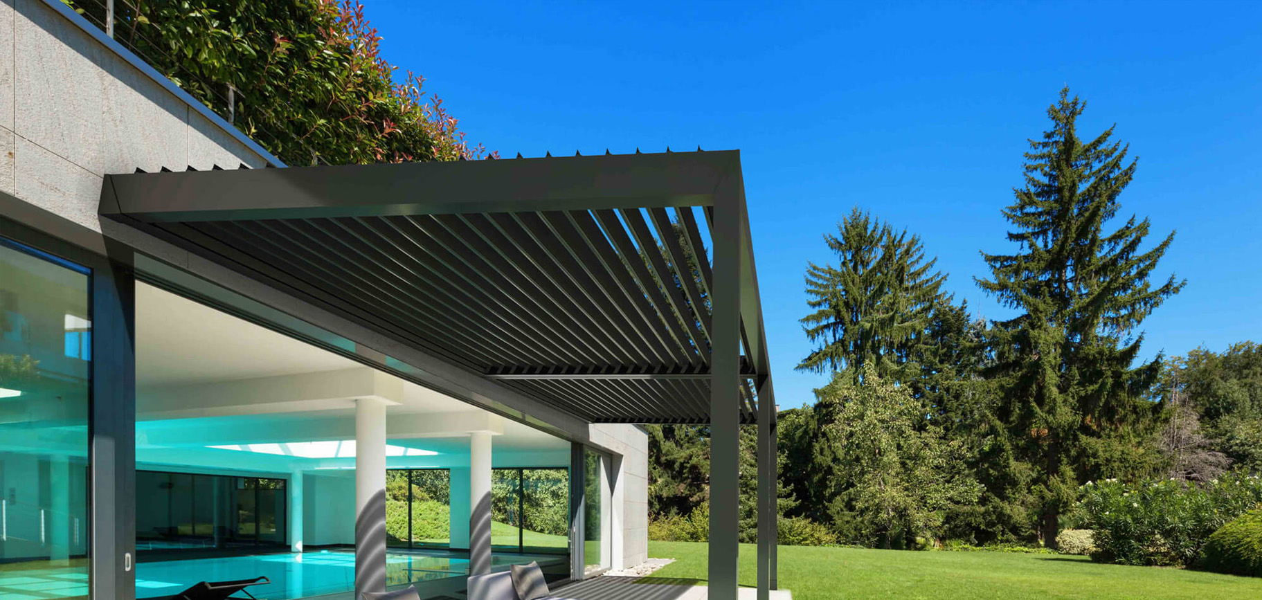 Struttura ombreggiante in alluminio con tetto a lame orientabili composta da un profilo grondaia perimetrale che permette la rotazione delle lame e lo scarico dell’acqua.