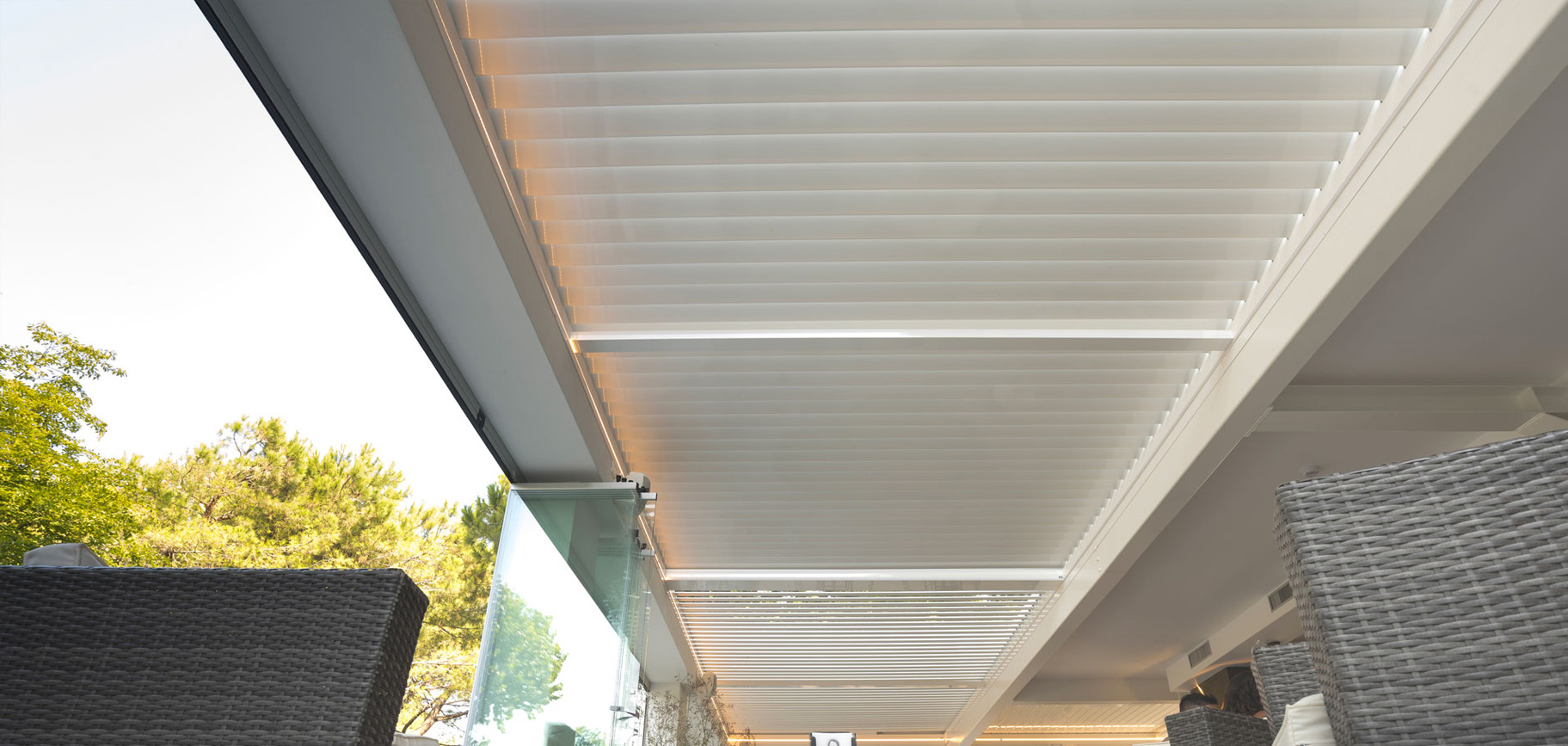 La tettoia bioclimatica in alluminio a lame orientabili composta da un profilo grondaia perimetrale che permette la rotazione delle lame e lo scarico dell’acqua.