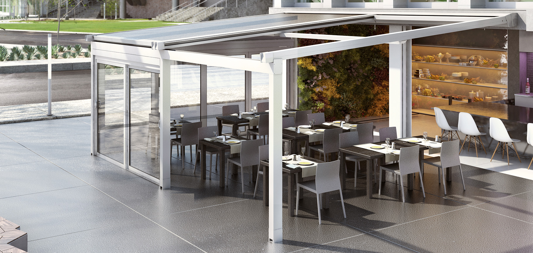 Pergola con tenda scorrevole, tessuto ad arrotolamento anziché a pacchetto, si adatta ad essere installata anche in ambienti architettonici estremi, raggiungendo notevoli sporgenze con pendenze contenute.