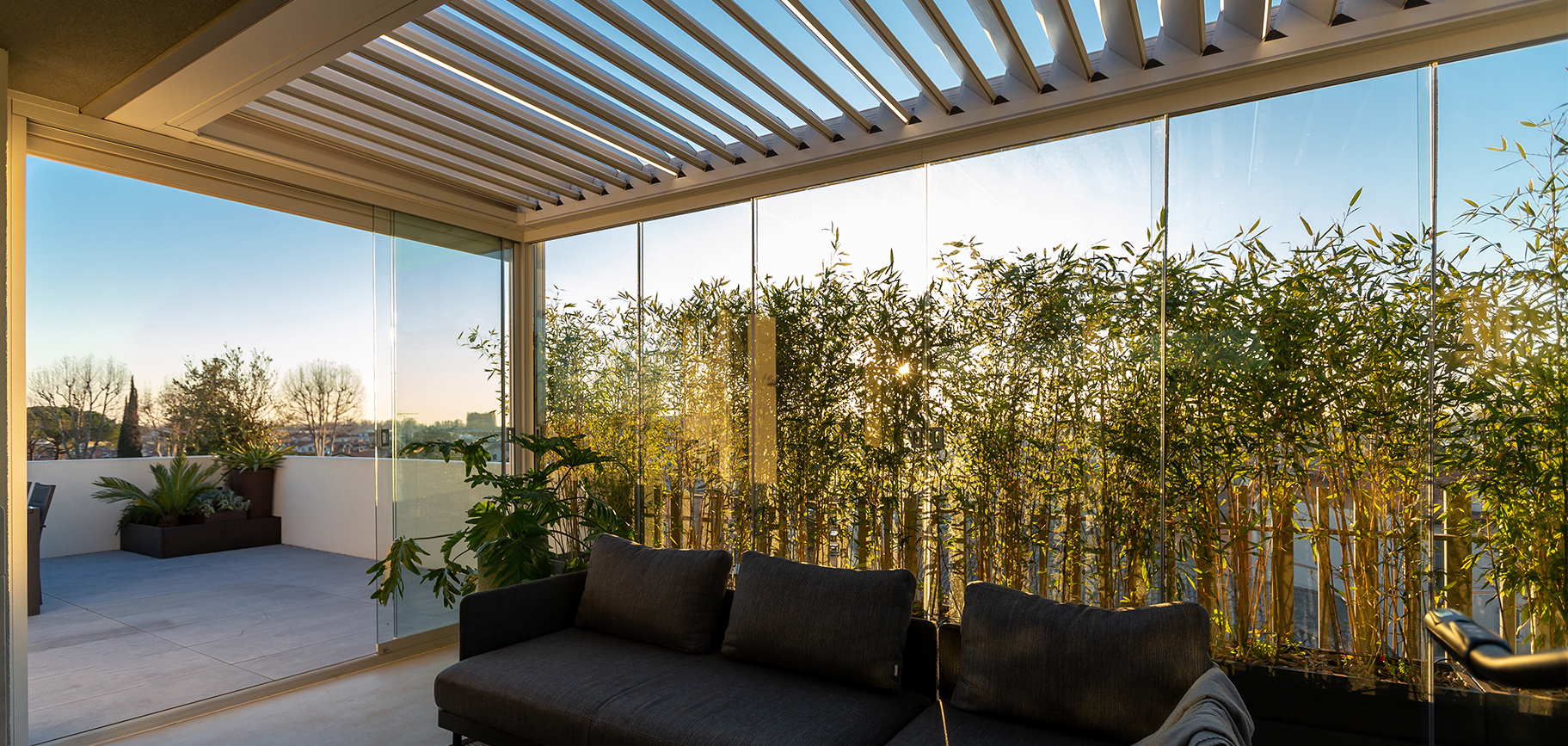 Vetrate scorrevoli con ante senza profili e guida a pavimento ridotta in altezza a soli 18mm. Di...