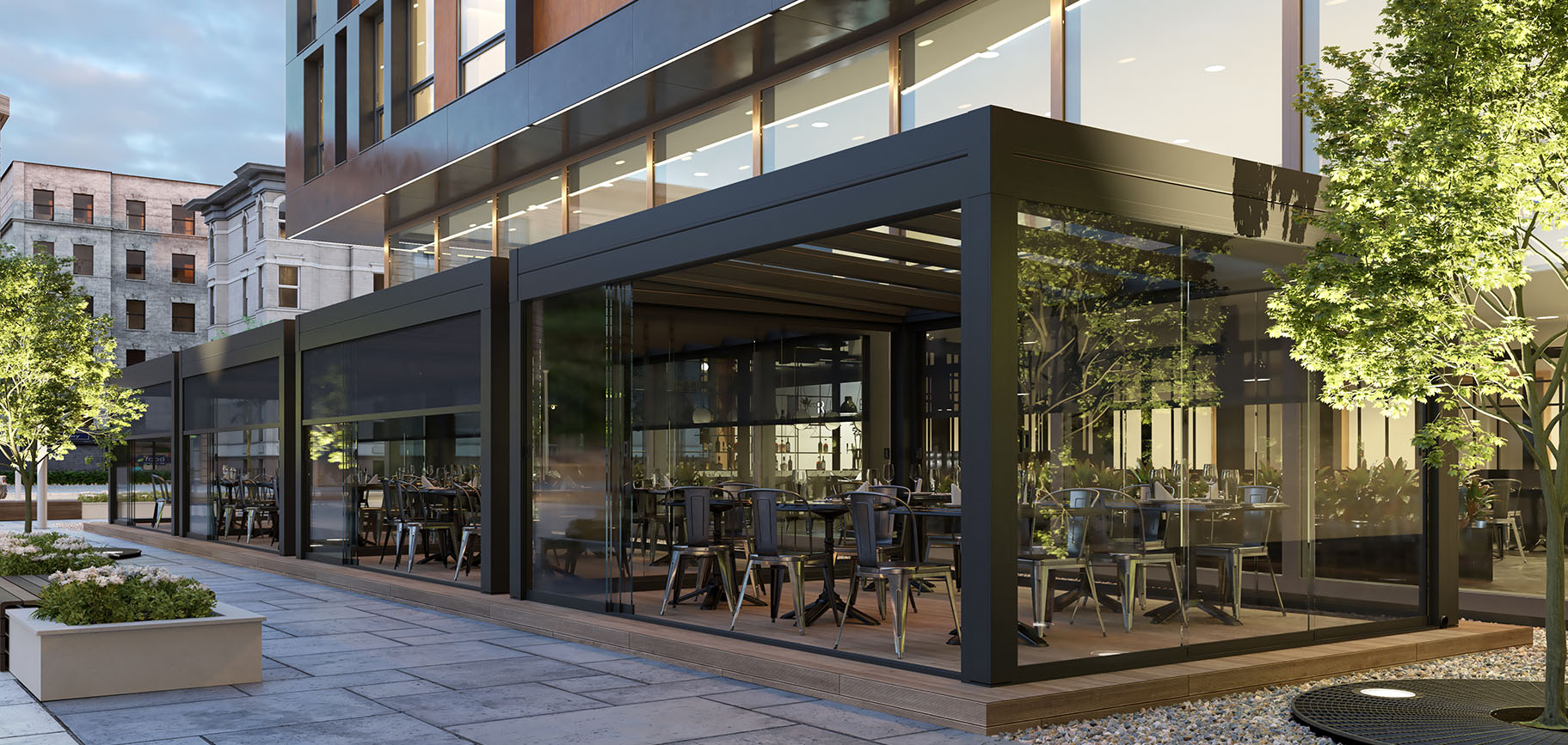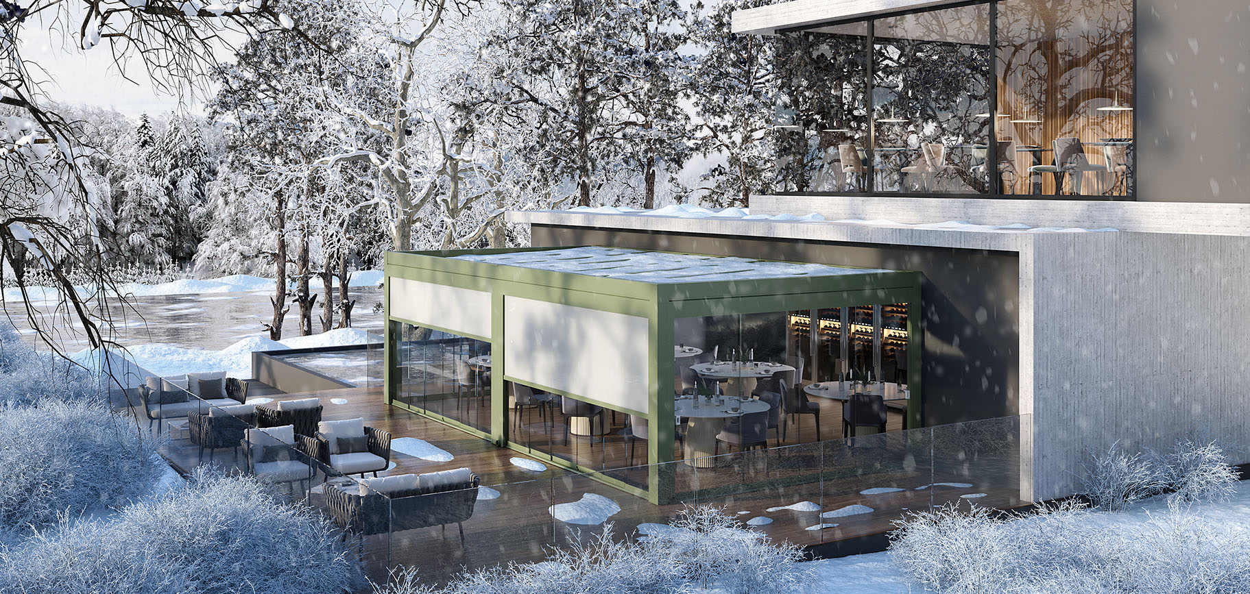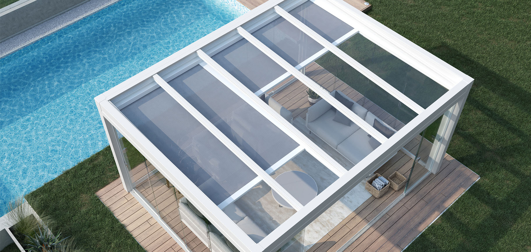 Possibilità di chiusura con tende tecniche verticali integrate, sistemi di vetrate scorrevoli e Roof tens per una schermatura sopra e sotto tetto