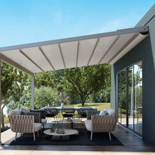 Vivere i vostri esterni non è mai stato così semplice: godere del calore dei raggi solari o rigenerarsi con la frescura di un’ombra riposante. Le pergole a tetto inclinato con copertura scorrevole a impacchettamento vi lasciano la libertà di gestire la luce in maniera personalizzata: l’apertura anche parziale del telo di copertura o l’inserimento di un doppio telo, uno resistente alla pioggia e l’altro di schermatura solare, vi daranno il pieno controllo della luce. Così sarete certi di vivere il vostro outdoor in qualsiasi situazione e condizione atmosferica.