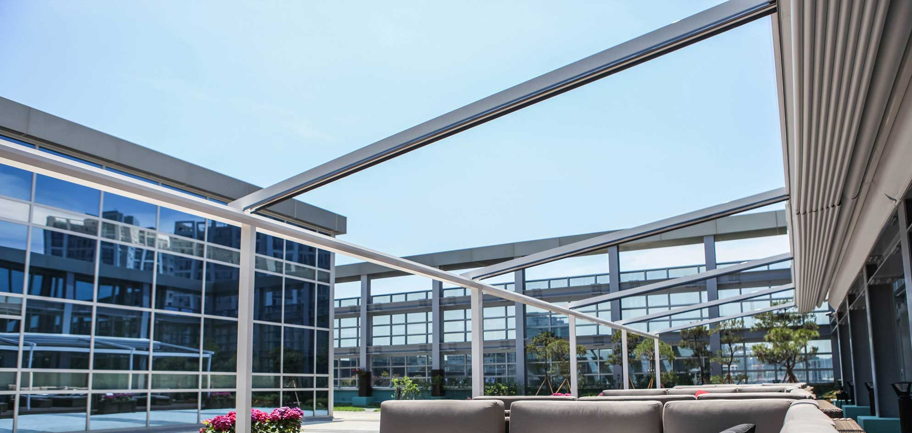 Pergolato in alluminio con copertura scorrevole ad impacchettamento con telo fissato ad un sistema di traversi, carrelli e guide che ne permettono lo scorrimento orizzontale.