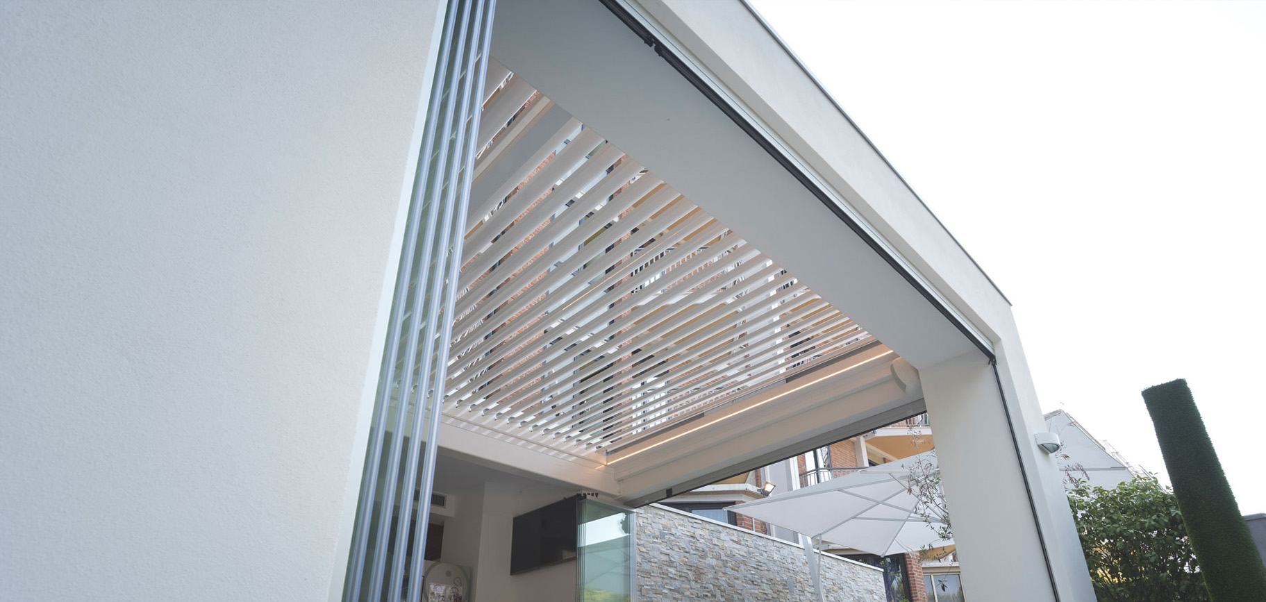La tettoia bioclimatica in alluminio a lame orientabili composta da un profilo grondaia perimetrale che permette la rotazione delle lame e lo scarico dell’acqua.