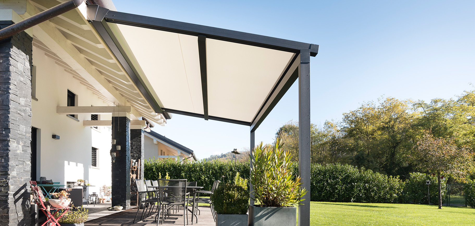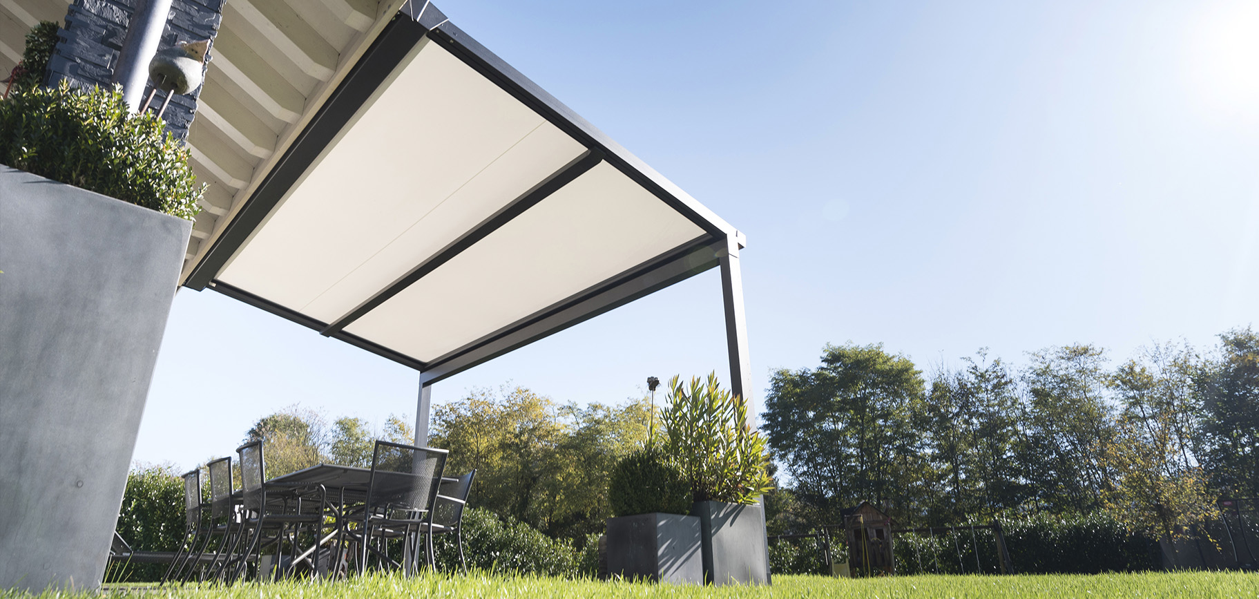 Pergola con tenda scorrevole, tessuto ad arrotolamento anziché a pacchetto, si adatta ad essere installata anche in ambienti architettonici estremi, raggiungendo notevoli sporgenze con pendenze contenute.